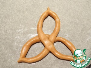 Теперь раскатываю второй жгут, формую из него круг, соединяя концы, и укладываю его на первую заготовку из трех петель, чуть прижимаю круг к нижнему тесту.