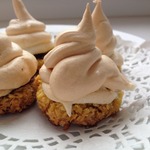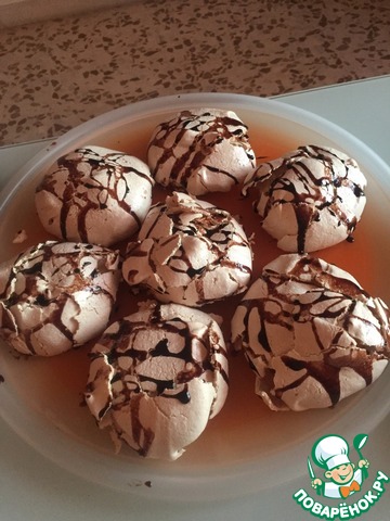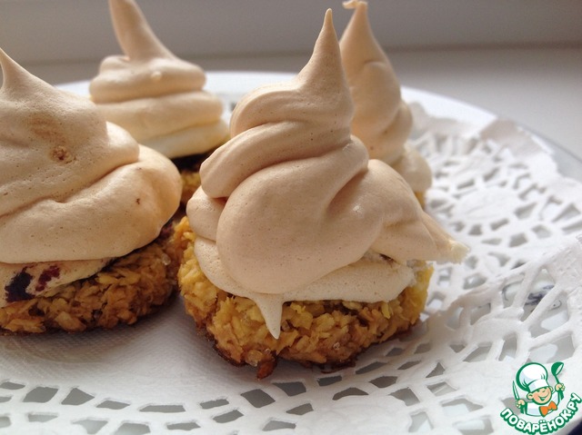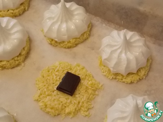 На середину каждой лепешки из кокосового теста кладем кусочек шоколада и отсаживаем сверху безе из кондитерского мешка или просто ложкой. Подровнять края. Они не растекутся.