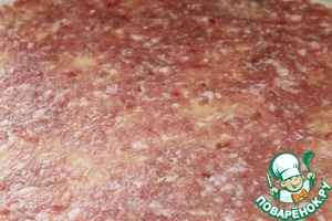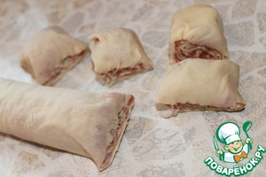 Тесто разделить на 4 части, раскатать в тонкие пласты, смазать мясным фаршем и свернуть в очень плотный рулет. -