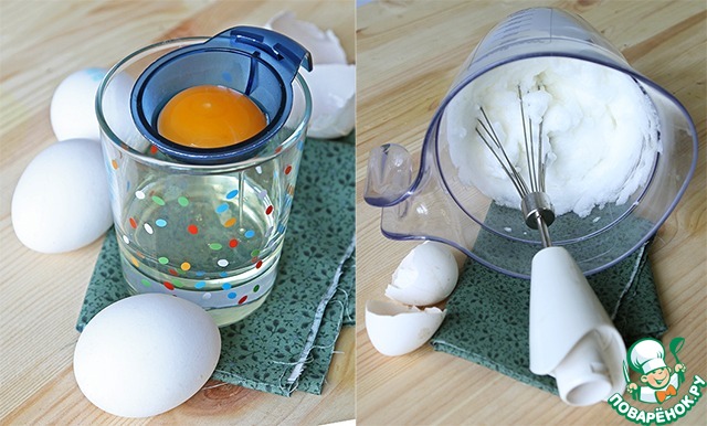 Включаем духовку разогреваться до 180 градусов, достаем яйца, разделяем на белки и желтки. В белки добавляем щепотку соли и взбиваем до густой пены.