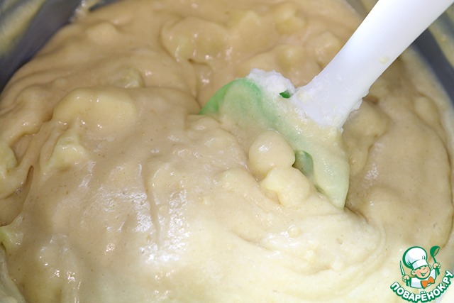 После этого перемешиваем тесто с нарезанными яблоками и выкладываем в форму, постучим немного формой с тестом и - в духовку!