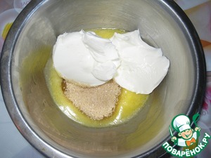 Сначала приготовим начинку. Растопите сливочное масло и дайте ему остыть. Добавить творожный сыр (типа Альменте) и коричневый сахар Мистраль.
