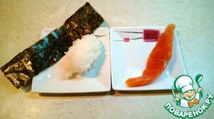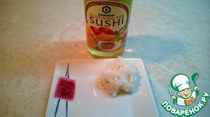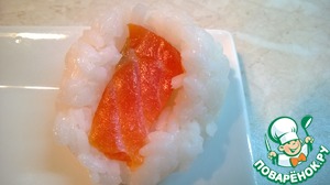 Из остывшего риса делаем шарик и вкладываем в него кусочек рыбы. Не забываем смачивать руки раствором воды с приправой для суши Киккоман (10:1).