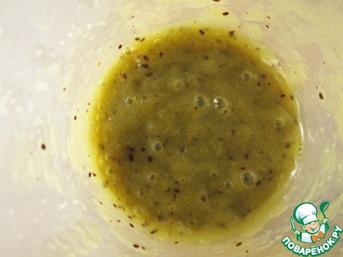 Рецепт не хитрый и с минимумом продуктов. Приступим. 2 киви почистить и пюрировать в чаше блендера с 70 гр сахара, поставить в холодильник.