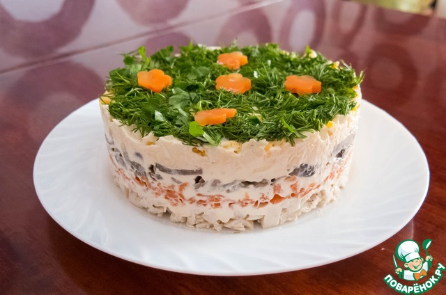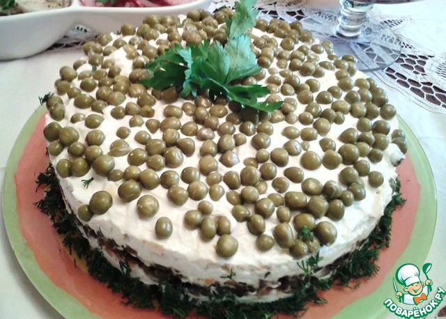 куриное мясо, майонез, морковь, грибы с луком, майонез, сыр, яйца, майонез, верхний слой - консервированный зеленый горошек.