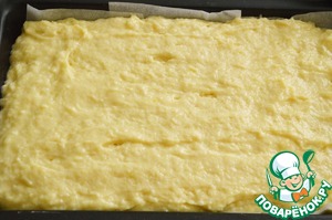 2. Затем в тесто добавить масло и вмешать его в тесто лопаткой. Тесто выложить в форму, смазанную маслом. У меня 15*20 см. Духовку нагреть до 180С.