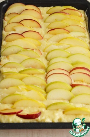 3. Яблоки разрезать на 4 части. Удалить сердцевину и нарезать пластинками. Сверху на тесто выложить яблоки, вдавливая в тесто. Выпекать пирог примерно 40 минут, до сухой лучины.
