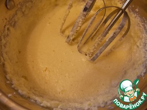 Масло надо выложить заранее, чтобы оно стало мягким. Добавить сахар и взбить. Затем, взбивая, добавить яйца по одному. И еще раз хорошенько взбить.