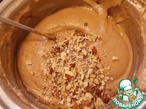 Теперь положить тесто из манки и еще раз хорошенько взбить. Тесто при этом становится тягучим. Я его называю резиновым. Добавляем орехи и перемешиваем.