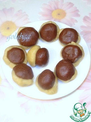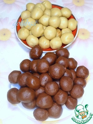 От каждого теста отщипываем по кусочку (приблизительно по чайной ложке, можно меньше) и скатываем шарики. Количество белых шариков = количеству коричневых.