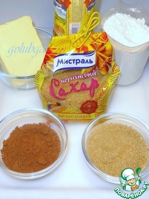 Для приготовления двухцветного курабье возьмём муку, сахар Мистраль, масло сливочное комнатной температуры, масло подсолнечное, какао.