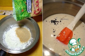 Приготовим мороженое. Сухое молоко, сахар и 250 мл молока размешать до однородности. Стручок ванили разрезать пополам, извлечь семена, вместе со стручком добавить в молоко. В 50 мл молока развести крахмал.