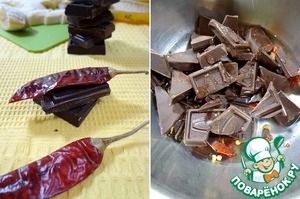 Для шоколадного соуса раскрошить 2 маленьких перца чили, добавить воду и шоколад. Поставить на средний огонь, постоянно мешать, пока не получим однородную консистенцию. Процедить соус через мелкое сито, разлить по маленьким креманкам, украсить каждую стручком перца.