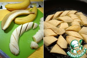 Бананы хорошо вымыть, разрезать вдоль пополам, аккуратно снять кожуру. Для того, чтобы кожура не потемнела внутри, можно смазать её небольшим количеством лимонного сока. Крупно порезать бананы. На сковороде растопить сливочное масло, выложить кусочки бананов.