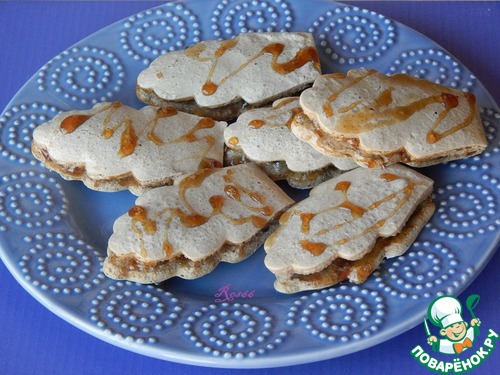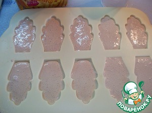 Далее берем формочки для мадленок, смазываем их и выкладываем нашу сахарно-кофейную массу. Ставим в духовку при t 140 градусов на 1,5 часа. За это время печенье сверху застывает, а нижняя сторона остается мягкой, пластичной (не тянется, как в некоторых безе, а именно мягкая и хорошо жуется). Затем достаем аккуратно наши печеньица, соединяем половинки мягкими сторонами. Больше между печеньями ничем не промазываем. В процессе выпечки, на дне формочек (под печеньем) образуется немного сиропа, который затем застывает. Вот как раз им я и украсила печенье.