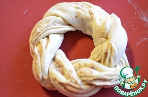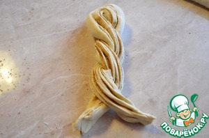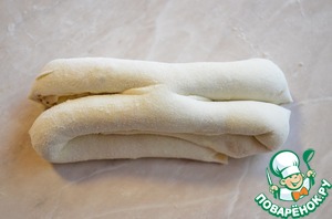 Первый вариант формовки: Свернуть тесто плотным рулетом и разрезать на две части как показано на фото, не разрезая до одного конца.