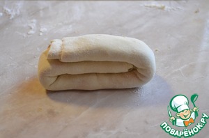 Присыпать рабочую поверхность мукой, хорошо раскатать тесто и разделить на 4 части (четвертый пласт в кадр не влез)