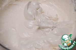 1. Белок взбить в пышную пену, затем постепенно, по 1 ложке, ввести сахар, постоянно взбивая. Должна получиться плотная, гладкая и блестящая масса. В конце добавить уксус, затем крахмал.