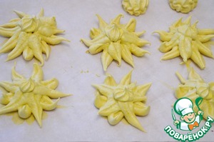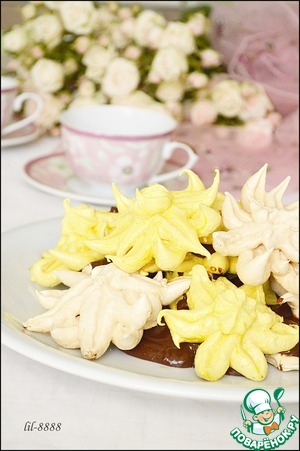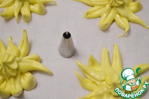 2. Противень застелить пергаментом. Белковую массу разделить на 2 части. В одну добавить куркуму для желтого цвета. Затем с помощью кондитерского мешка и насадки, как на фото, отсадить безе в форме цветов. Для этого нужно держать мешок с насадкой железным хвостиком вверх и отсаживать "лепестки" от центра к краям.