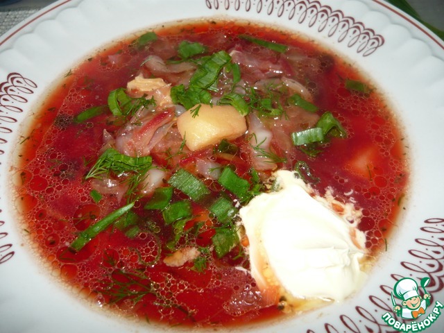 Рецепт «Свекольник из грудинки с малосольными огурцами»: