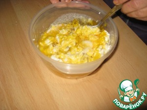 Делаем начинку и берем: 2 пачки творога или творожной массы ( я взяла 5 сырков с изюмом немного уменьшила кол-во сахара),1/2 стакана сахара, 4 яйца, 1 пакетик ванилина, изюм.