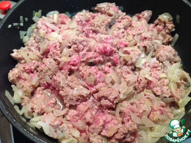 К луку добавим фарш и минут 10 обжариваем их вместе. Нужно хорошо всё перемешать, чтобы фарш не стал одним куском, а разошелся на крупинки