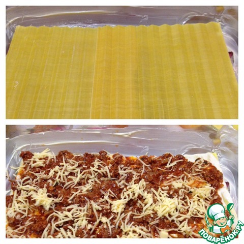 Последним слоем обязательно должны быть листы лазаньи, белый соус и тертый сыр.
