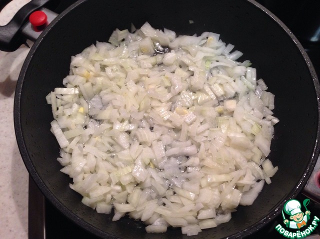 Начнем с красного). Для этого измельчаем лук и обжариваем на растительном масле до золотистого цвета -