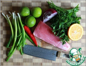 Филе тунца разморозить, полить соком одного лайма, посолить и убрать в холодильник на час. Тунец побелеет по краям – это нормально! /Его уже можно есть – очень вкусная рыбка получается/