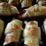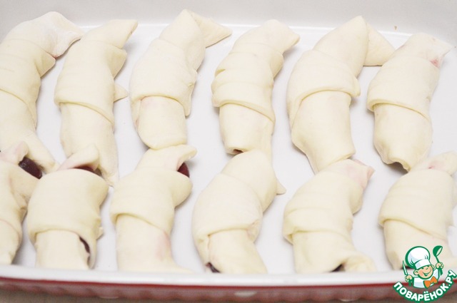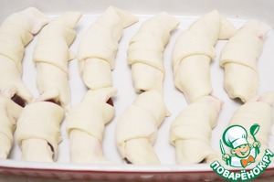 1. Тесто раскатать в круг или прямоугольник. Разрезать на сегменты или треугольники. На широкую сторону треугольника класть 2-3 вишни и сворачивать в форме рогалика.