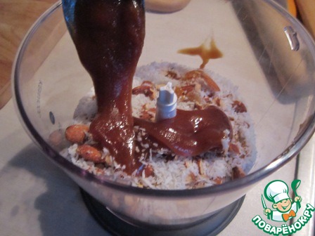 Теперь измельченные орехи, курагу, мед и немного кокосовой стружки кладем в блендер и тщательно перемешиваем до однородного состояния.
