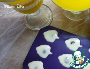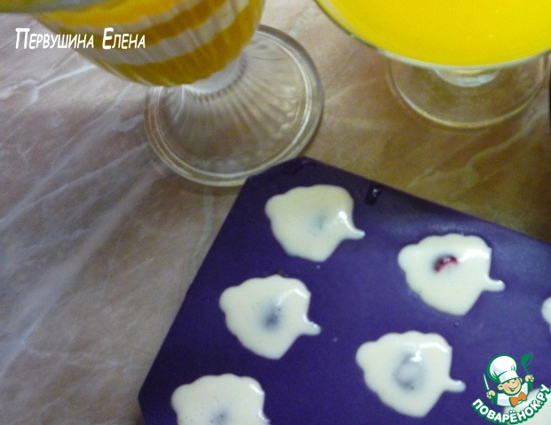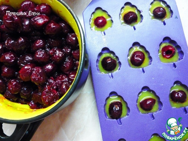 Заполняем наполовину апельсиновый соком (будущим желе) формочки для конфет. Кладем по вишенке и отправляем застывать.