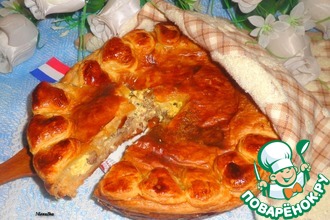 В центре пирога проделать пальцем небольшое отверстие, чтобы он в духовке не вздулся и не "взорвался". Ни в коем случае не протыкать пирог насквозь! Отверстие сделать только в верхнем слое теста!