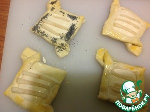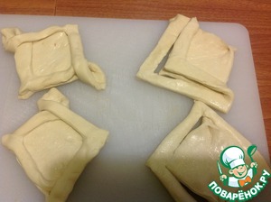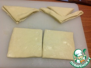 • Размороженное тесто разрезать на квадраты, свернуть треугольником и сделать надрезы как на фото (тесто не раскатываем)
