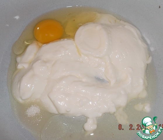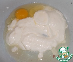 Яйцо, йогурт, сахар, соль, 1 ст. ложку подсолнечного масла смешать.