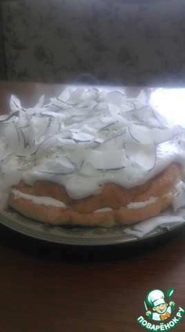 2/3 крема я намазала на нижний корж, а остальной крем вылила сверху. Посыпала кокосовыми чипсами.