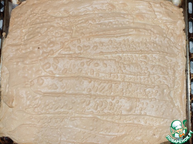 Выкладываем ее ровным слоем на смазанную бумагу для выпечки и отправляем в духовку. Я пекла при t=160* 20 минут (ориентируйтесь на свою духовку. корж нельзя пересушить, иначе он при сворачивании поломается)