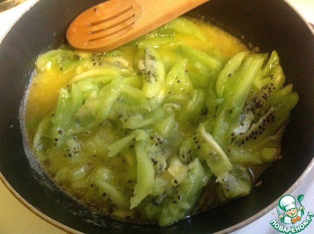 Киви очистить, нарезать соломкой или как вам нравится. Выложить на сковороду масло и сахар