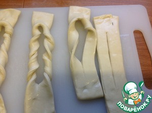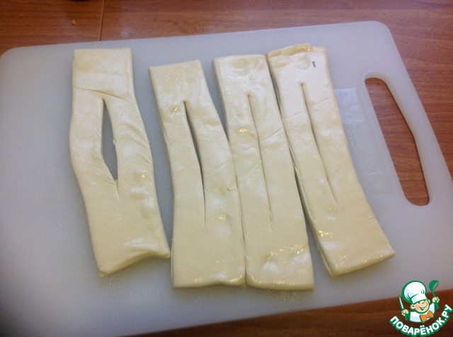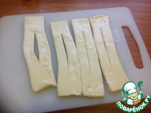 Размороженное тесто разрезать на пластины и посередине сделать надрез (тесто не раскатывать)