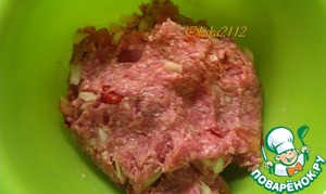 Тем временем мясной фарш, состоящий из говядины и свинины (50/50), соединяем с порезанным репчатым луком, чесноком, яйцом, солью, перцем и нарезанной кубиками паприкой. Всё тщательно вымешиваем.