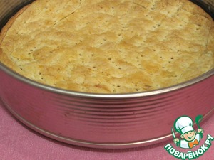 Вырезать из теста круг, уложить в смазанную маслом разъемную форму д.26 см, сделать на поверхности теста множество проколов вилкой, выложить в духовку, нагретую до 220 градусов, выпекать 10 минут до золотистого цвета.