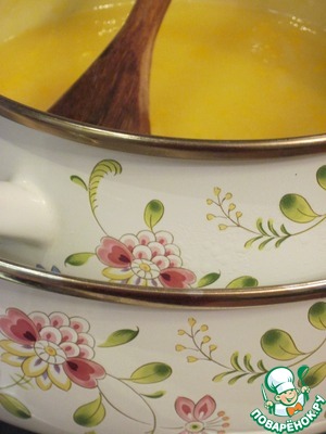 Отделить желтки от белков. Приступить к приготовлению заварного крема. Для этого в кастрюлю налить молоко, добавить сахар, добавить желтки. Кастрюлю поставить на водяную баню. Варить крем, постоянно помешивая, до загустения. Первые 10 минут крем почти не густеет, он только прогревается, потом постепенно начинает густеть, наберитесь терпения. Белки в нашем рецепте не используются. Подумайте заранее над тем, что из них приготовить. Можно испечь безе.