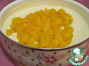 В это время персики вынуть из банки, уложить на сито, чтобы лишняя жидкость с них стекла. Затем нарезать на небольшие кусочки.