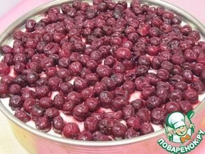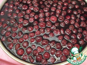 Залить вишню сиропом с желатином. Поставить торт в холодильник до полного застывания.
