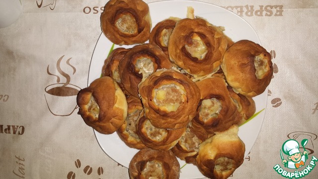 Муку перетереть с маргарином, добавить молочно-дрожжевую смесь и замесить тесто. По ходу замеса если тесто жидковато добавить еще муки. Смотрите по консистенции, готовое тесто не должно липнуть к рукам.
