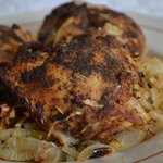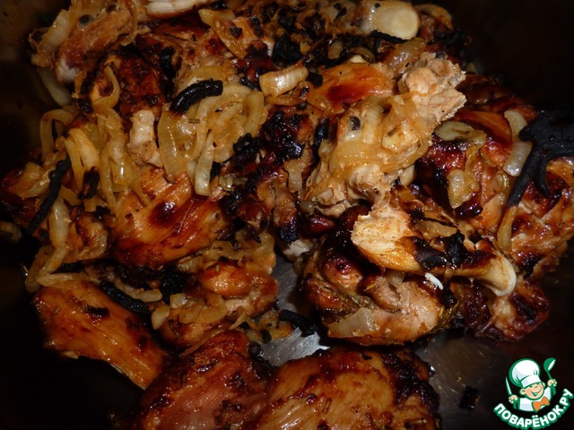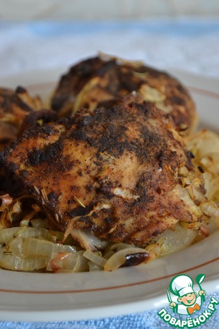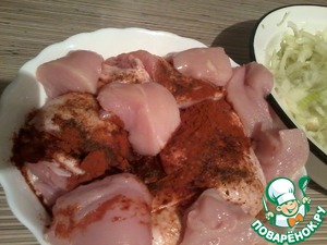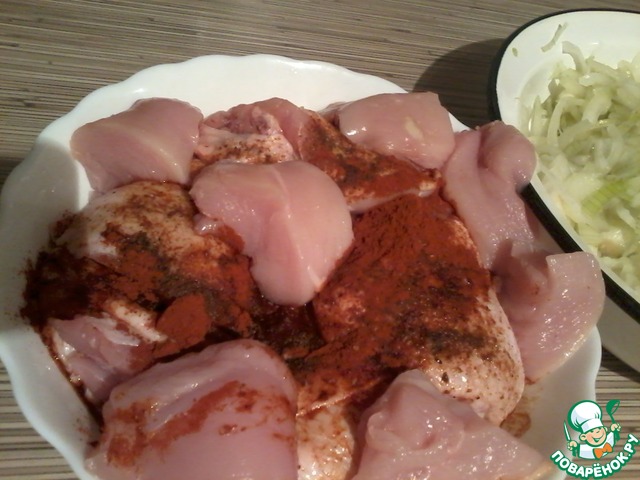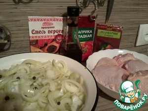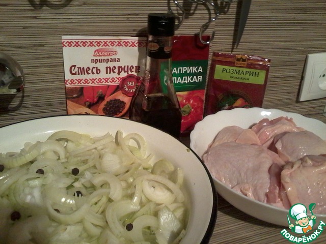 Много воды утекло с тех пор..., и розмарин с паприкой, стали не чем-то там, из шершелей фам, а свалились до среднестатистической петрушки!) Пользуясь случаем, привлекаем и их, гламурных, к рецепту!). И еще у меня было немного филе, я добавлю их к 6 куриных бедрышкам и 1 кг. лука. Чистим его и нарезаем полукольцами, курицу задабриваем перцем, паприкой и соевым соусом
