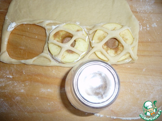 От общего куста теста взять примерно 300 гр., раскатать в пласт, выложить яблоки, порезанные кольцами, отступив от края. Роликом для сетчатой нарезки пройтись с нажимом вдоль теста, сеточку растянуть.