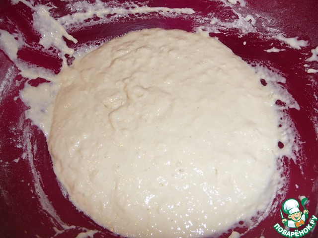 Через 2 часа дрожжи поднялись шапкой, можно приступать к замешиванию теста.