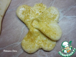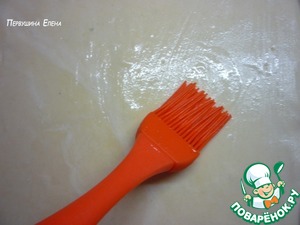У меня уже был готовый сироп. Но все же: отварить тертый имбирь в воде примерно 15 минут с момента закипания. Процедить. Отлить в отдельную кастрюльку 3 ст. л. имбирной воды, добавить 1 ст. л. коричневого сахара и варить с момента закипания буквально 2-3 минуты, иначе уже получатся конфеты. И смазываем этим ароматным сиропом тесто.