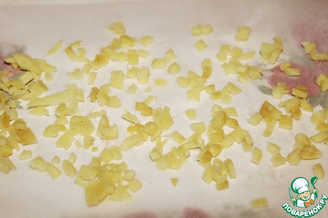 Корень имбиря очистить, мелко нарезать, положить на застеленный пекарской бумагой противень, и запечь в течение 10 минут в духовке, разогретой до 200 градусов. |
